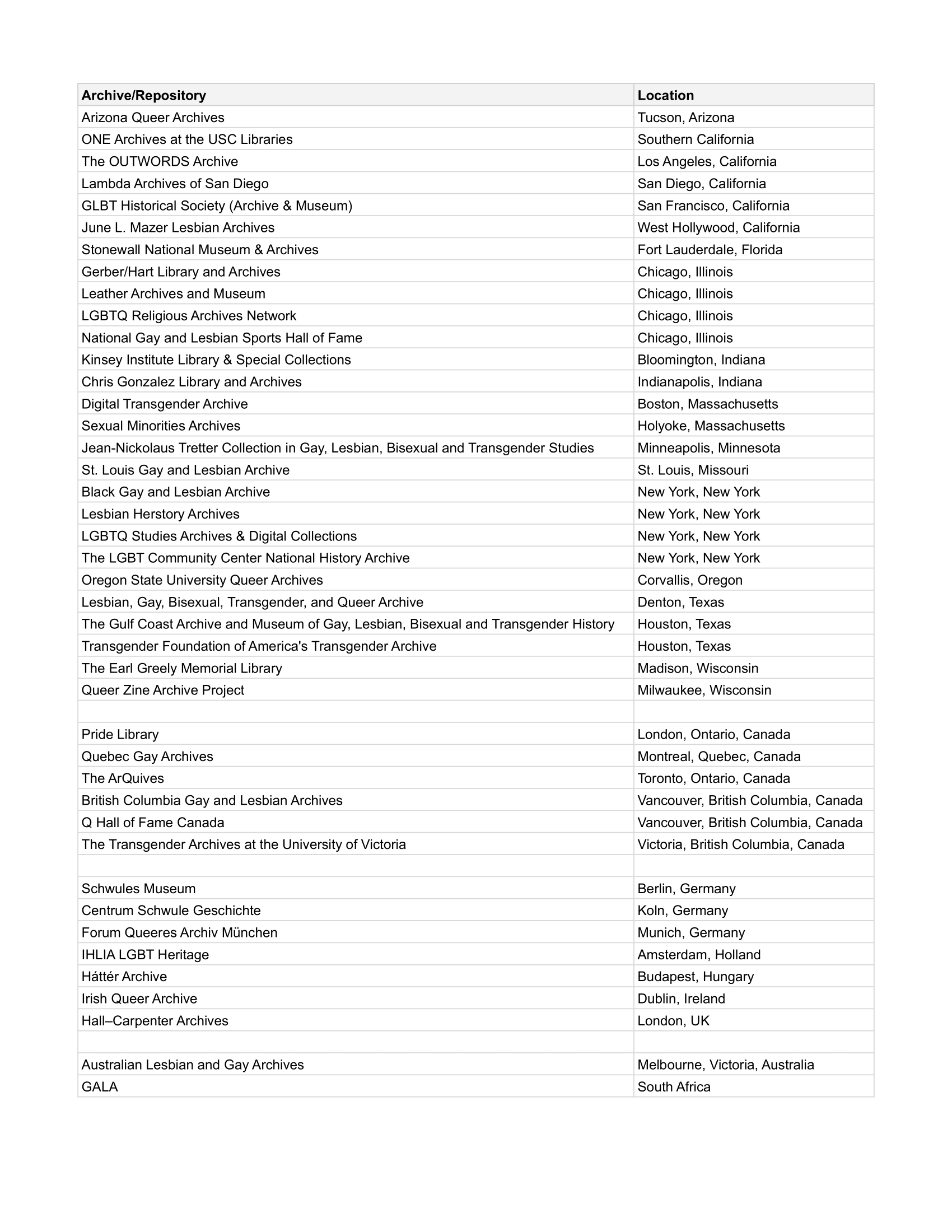Around the world, various organizations and institutions have taken it upon themselves to record and preserve LGBTQ+ History, heritage, and records. These repositories contain an abundance of information about the gay liberation movement, queer people, queer experiences, and much more. They contain original artifacts and documents like magazines, newspapers, photographs, letters, memorabilia, etc. The following list is not exhaustive, but it contains some of the largest resources across the world. Many of these repositories have some of their materials available online, so check them out!